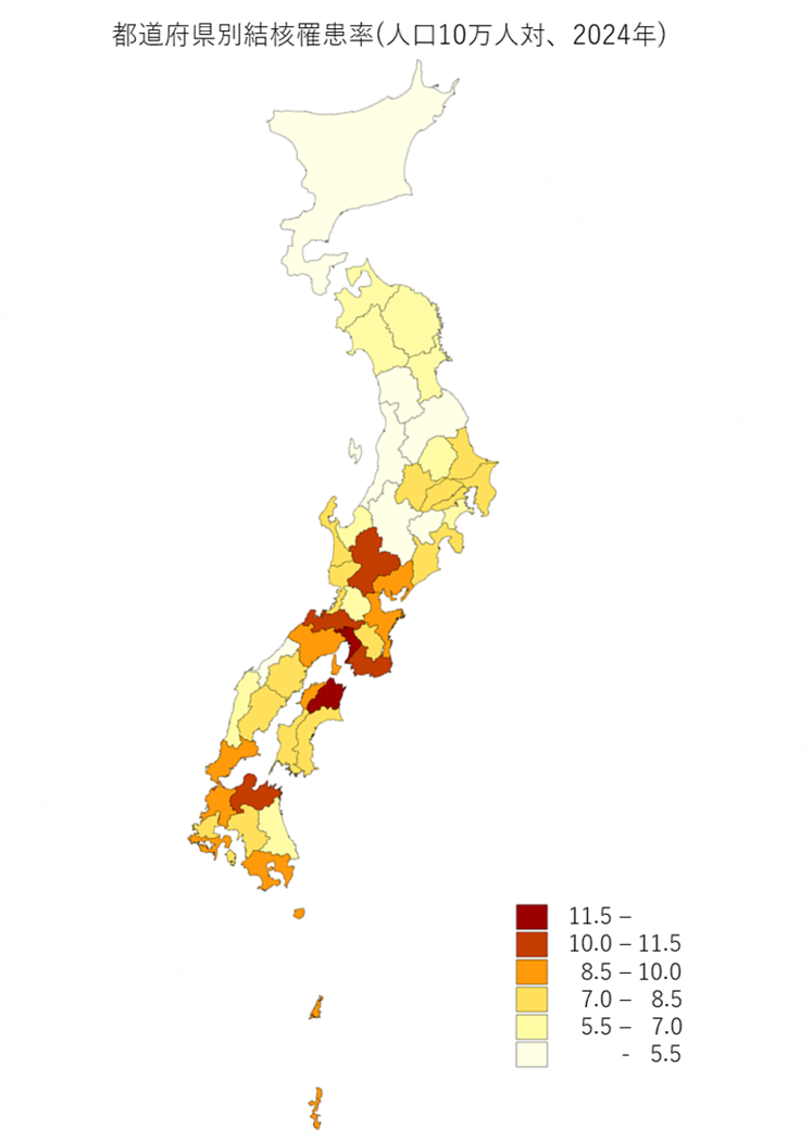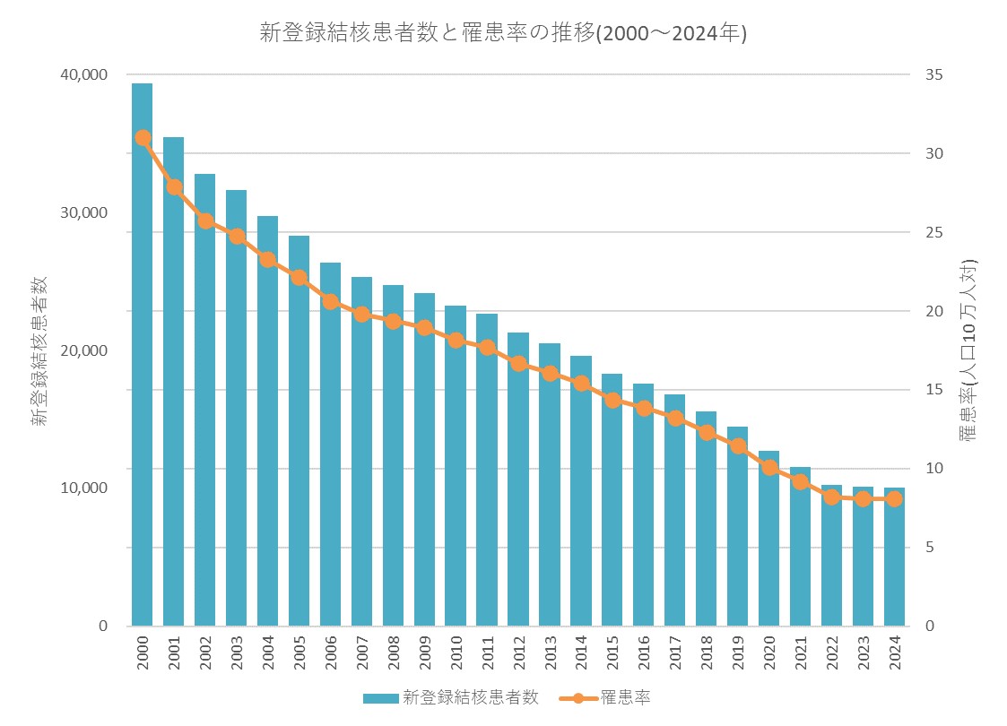 日本の結核罹患率は、2021年に9.2と結核低蔓延国の水準(罹患率10.0以下)を達成し、2024年も低蔓延国水準を維持している。