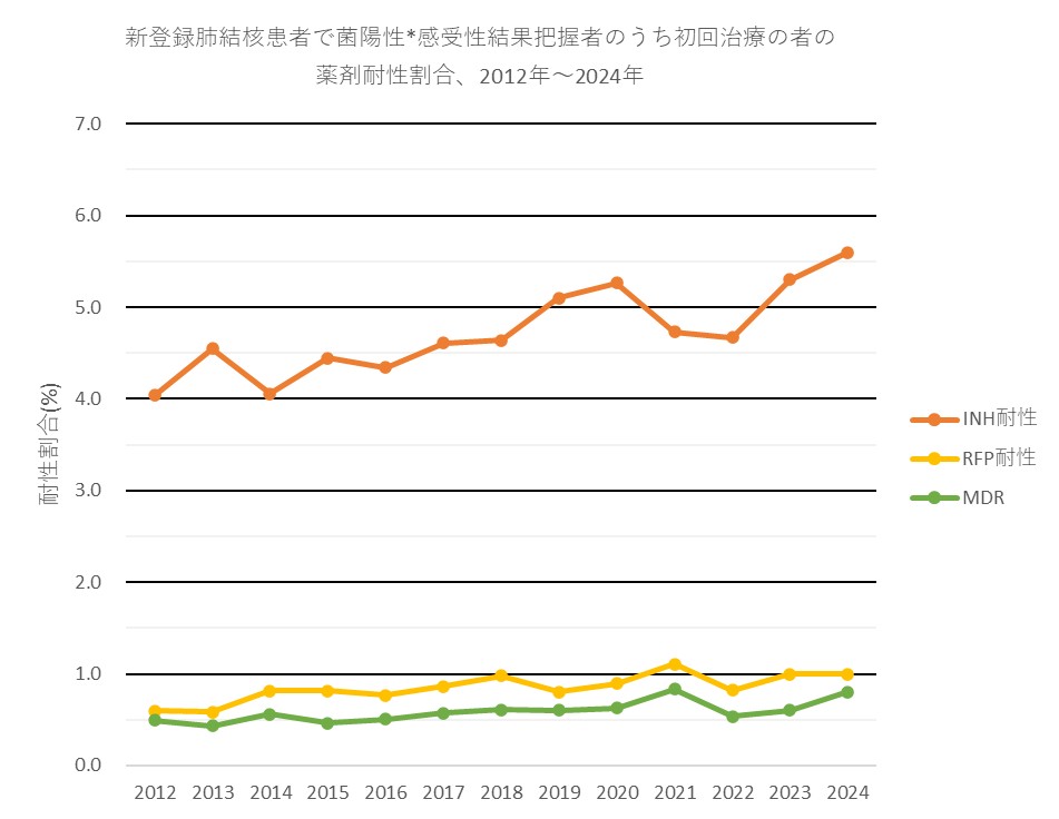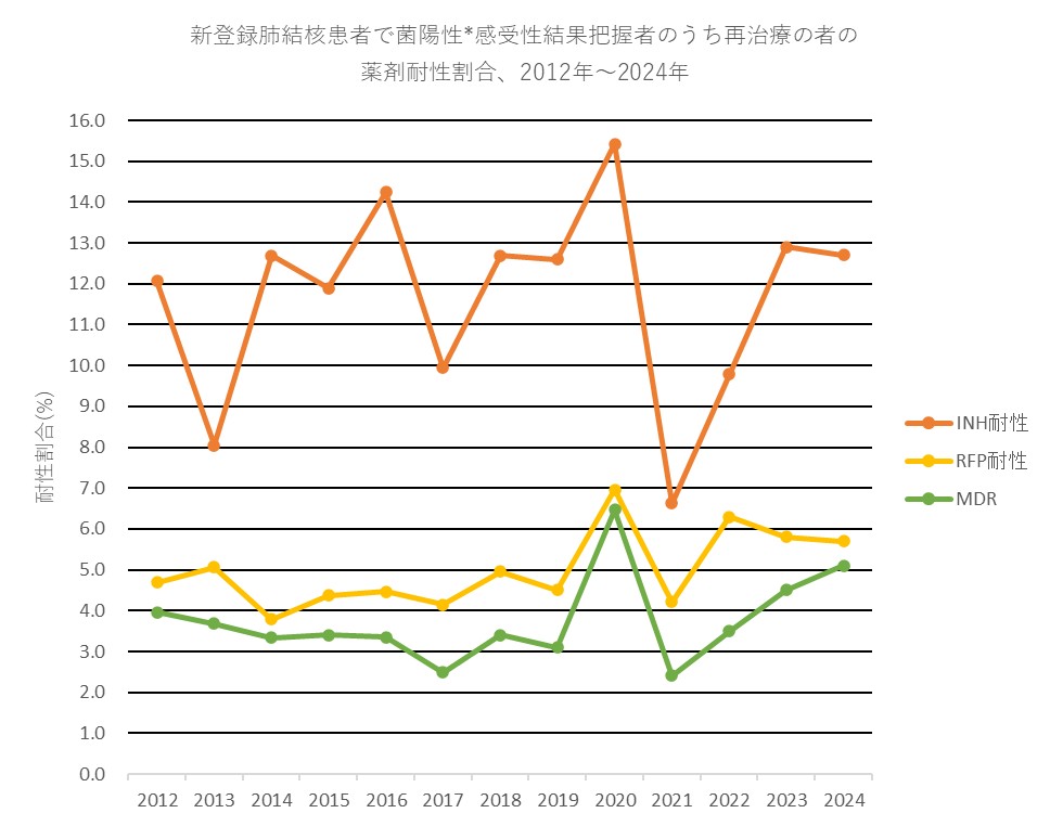 *2023年までは培養陽性。2024年は新登録肺結核患者のうち治療歴なし、または治療歴不明では、結核菌培養検査またはその他の結核菌検査での結果陽性を、治療歴ありでは、結核菌培養検査での結果陽性をさす。