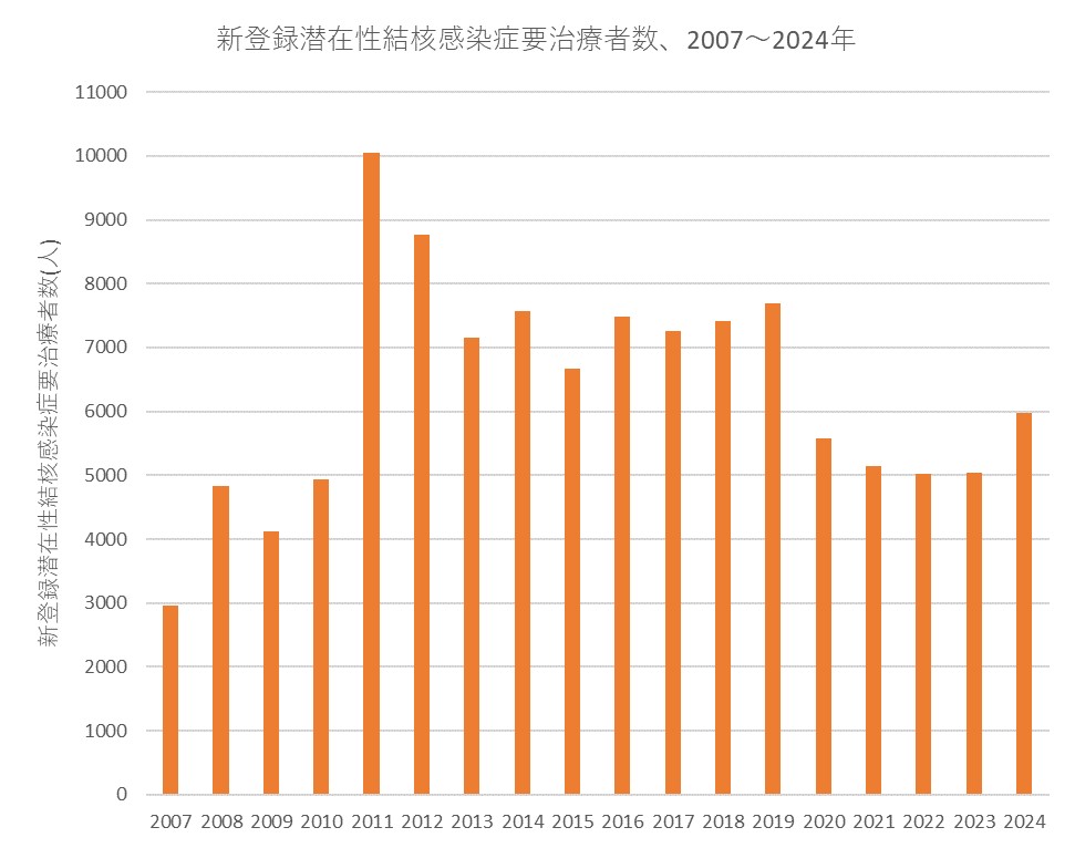2024年の新登録潜在性結核感染症要治療者数は、5,967人であった。そのうち、日本出生は4,637人(77.7%)、外国出生1,223人(20.5%)、不明107人(1.8%)であった。