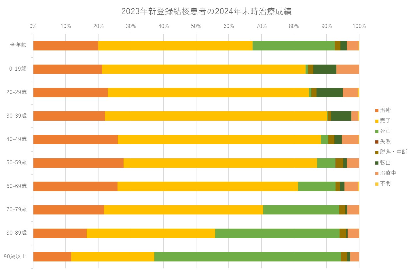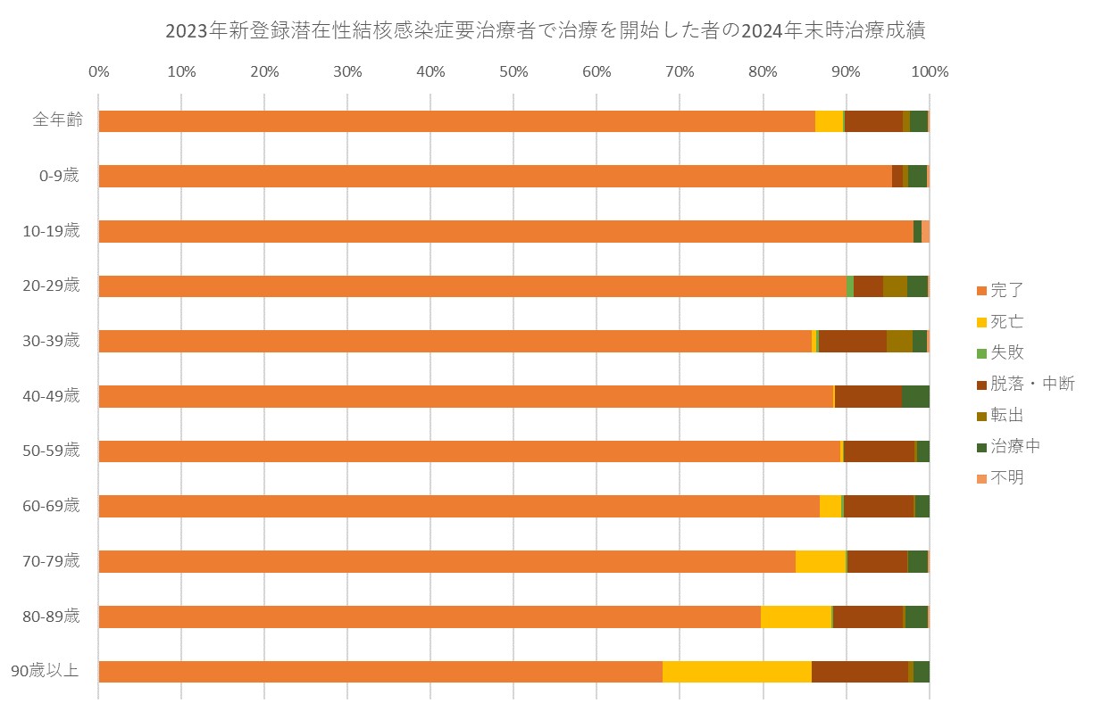 2024年末時点における、2023年新登録潜在性結核感染症要治療者で治療を開始した4,956人の治療成績は、治療完了86.3%、死亡3.3%、失敗0.2%、脱落・中断7.0%、転出0.8%、治療中2.2%、不明0.1%であった。