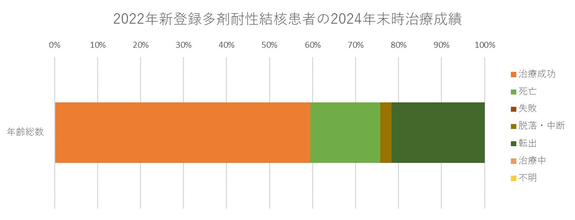 2024年末時点における、2022年の新登録結核患者のうちINHおよびRFP両剤が耐性である多剤耐性結核患者37人の治療成績は、治療成功59.5%、死亡16.2%、失敗0.0%、治療中断2.7%、転出21.6%、治療中0.0%、不明0.0%であった。