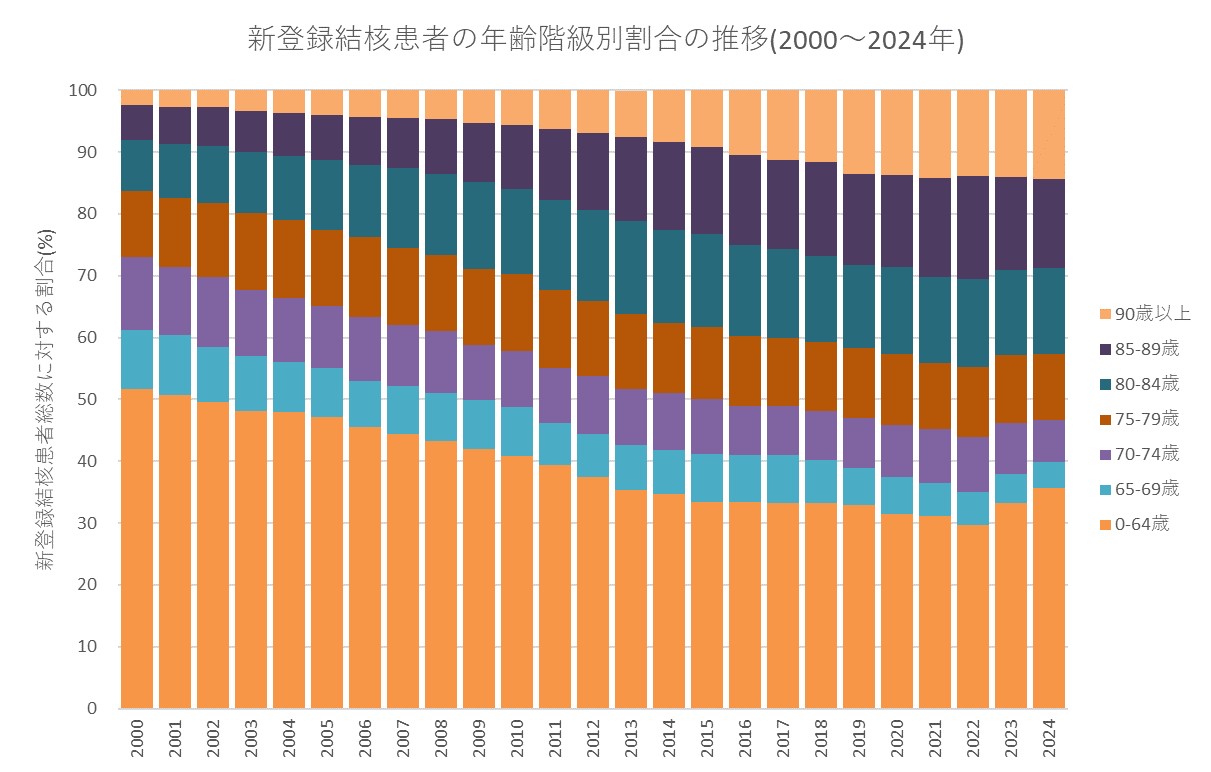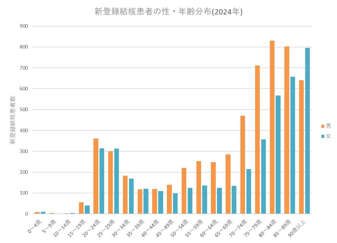 新登録結核患者の年齢の平均は66.9歳(男67.0歳、女66.9歳)、中央値は76歳(男75歳、女78歳)であった。