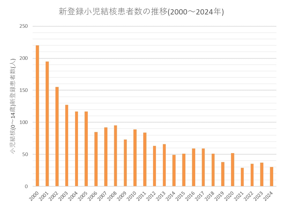 2024年の14歳以下の小児新登録結核患者数は30人(男16人、女14人)であった。そのうち、日本出生は23人、外国出生は7人であった。