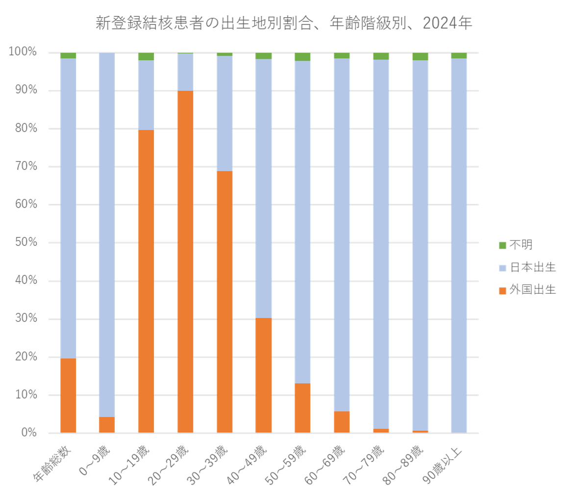 新登録結核患者総数のうち外国出生患者が占める割合は19.7%で、20~29歳では90.0%であった。