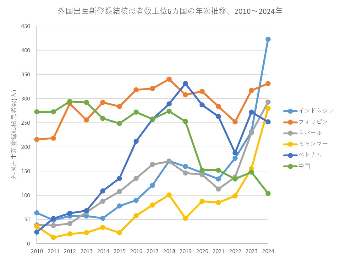 外国出生新登録結核患者の出生国はインドネシアが最多で、以下、フィリピン、ネパール、ミャンマー、ベトナム、中国となった。
